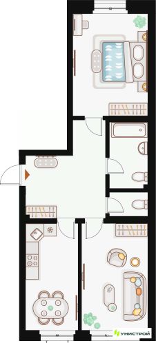 В квартирах выполняется предчистовая отделка с использованием качественных материалов: металлические двери, тепло- и шумоизоляция, энергоэффективные стеклопакеты, скрытая разводка коммуникаций и радиаторы с терморегуляцией.