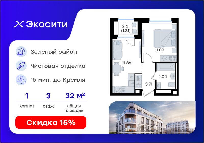 Продается 1-комн. квартира на 3-м этаже в строящемся проекте Экосити. Общая площадь лота составляет 32,01 кв. м, из которых 11,09 кв. м отведено под жилую и 11,86 кв. м под кухонную зону. Номер квартиры - 258 Преимущества квартиры в Урбан-квартале: • Квартира с полностью чистовой отделкой. В комнатах и коридоре: - натяжной потолок, - стены оклеены обоями под покраску, - полы: ламинат, плинтусы и напольная плитки - установлены межкомнатные двери и подоконники. В санузлах: - на стенах - керамогранитная плитка и/или окраска водостойкой краской - на полу - керамогранитная плитка; - натяжной потолок - сантехника: ванна и экран под ванну/душевой поддон, унитаз, раковины и смесители, монтаж водопровода и канализации - Предусмотрен расширенный пакет системы Умный Дом: бесключевой доступ в подъезд, видеодомофон с функцией Face ID, видеонаблюдение, автоматизированный сбор и передача показаний счётчиков; - На территории Урбан-квартала предусмотрено строительство детского сада на 360 мест, школы на 1501 место, детский развивающий центр на 2000 мест. - Рядом с с кварталом Резиденции запланировано строительство детского сада на 360 мест, школы с детским развивающим центром на 1501 место - На первых этажах домов Урбан-квартала запроектированы коммерческие помещения - предусмотрены места для супермаркетов, бытовых услуг, кафе. - Собственный комьюнити-центр для жителей Урбан-квартала - Клуб Резидентов для жителей квартала Резиденции - бульвар "Река между камней" с плейхабом для детей, амфитеатром, спортивными зонами, аллеей достижений. Всем посетителям будет доступен иммерсивный маршрут и AR-игры. - Тайная тропа вдоль которой расположатся зоны тихого отдыха, йоги и медитаций - 2 смотровые площадки - Снейк-ран - Круговой спортивный маршрут - Специальные зоны для выгула собак - В Урбан-квартале предусмотрено строительство 2 многоэтажных паркингов на 300 и 360 машиномест. Всем жителям проекта доступен и привычный плоскостной паркинг вокруг территории проекта с возможностью в приложении дома получить информацию о наличии парковочных мест. - В квартале Резиденции предусмотрен подземный паркинг на 260 машиномест Экосити — это совершенство города в первозданной природе. Наполненный возможностями квартал, в котором вы не выбираете между городом или природой, семьей или работой, отдыхом или спортом, — вы берете всё сразу. Каждая семья, каким бы составом она ни жила, найдет для себя идеальное пространство. Планировочные решения разнообразны, также как и возможности отделки от черновой до полностью с ремонтом. Здесь запроектированы квартиры с просторной кухней-гостиной, чтобы семья могла комфортно проводить время вместе. Квартиры сдаются с современной качественной отделкой, что позволяет после сдачи дома сразу начать жить, избежав долгих самостоятельных ремонтов. Цветовые решения и стиль отделки можно выбрать при покупке квартиры. Резиденции сдаются в черновой отделке, вы могли реализовать ваши самые смелые дизайнерские решения. Каждая резиденция это баз