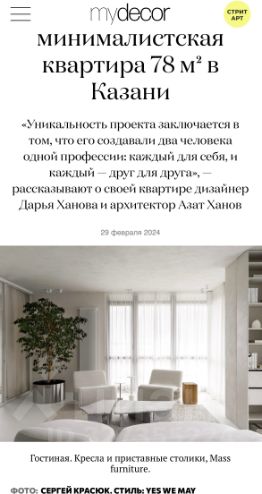 Это личная квартира известных казанских дизайнеров. Одна из самых стильных минималистичных квартир в городе. Квартира получила множество публикаций в профессиональных российских и зарубежных медиа.