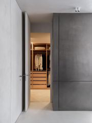 Большинство предметов мебели — уникальные, выполненные по индивидуальным эскизам дизайнеров, а также мебель европейских брендов. В отделке использованы материалы премиум-класса: французский микроцемент, нержавеющая сталь, натуральное дерево. Вся корпусная мебель — скрытая; шкафы и двери выполнены до потолка, от премиальных производителей.