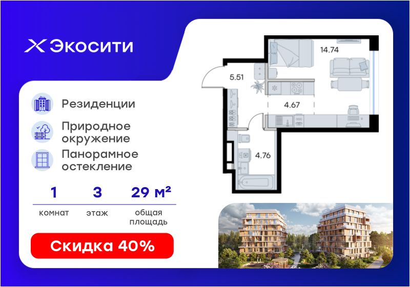 Продается квартира-студия на 3-м этаже в строящемся проекте Экосити. Общая площадь лота составляет 29,68 кв. м, из которых 14,74 кв. м отведено под жилую и 4,67 кв. м под кухонную зону. Номер квартиры - 225