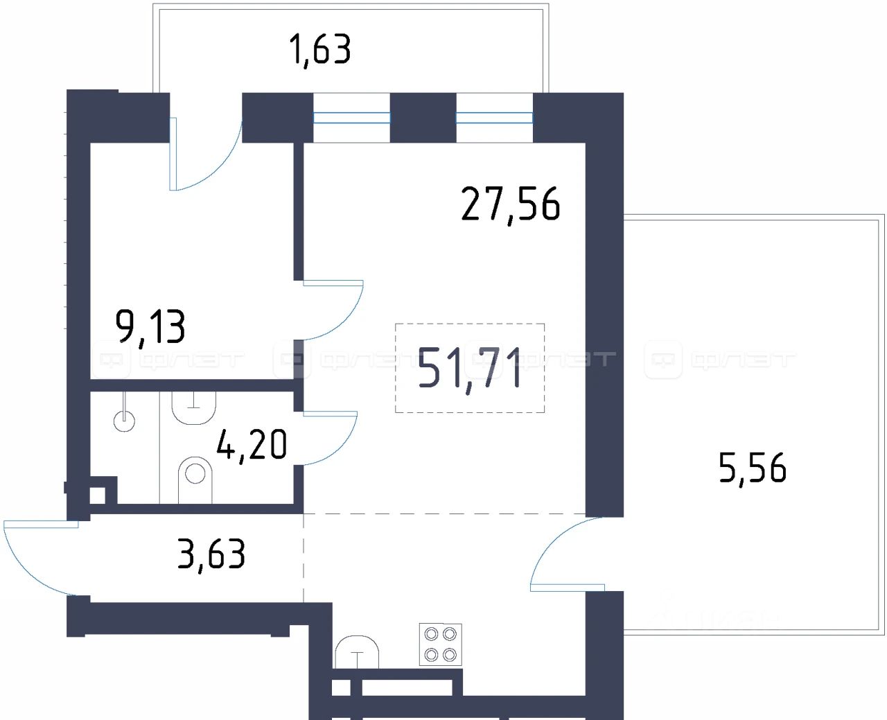 1-комнатная квартира 51.71 м² на 2 этаже в строящемся клубном доме премиального-класса "Уналты".