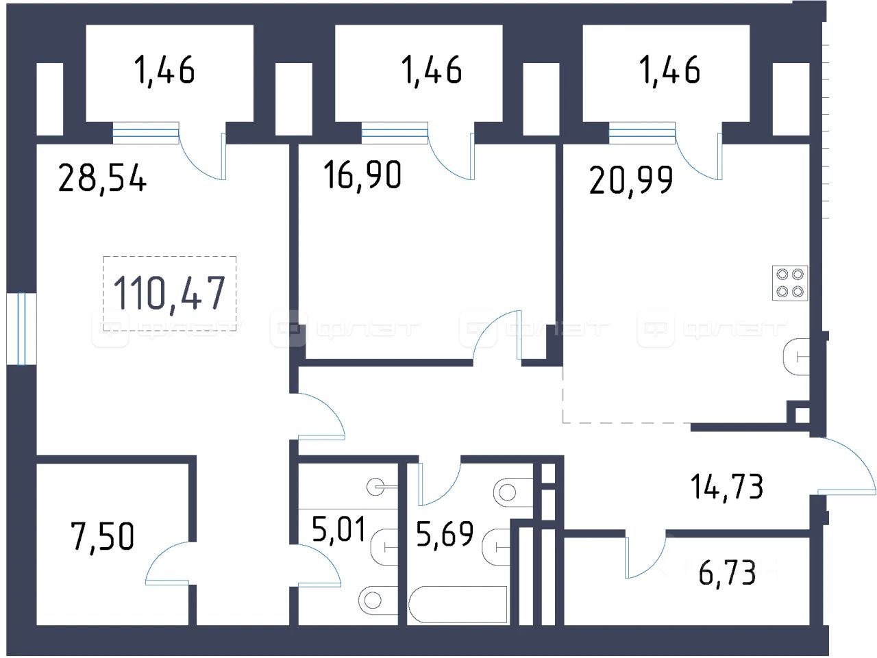 2-комнатная квартира 110.47 м² на 4 этаже в строящемся клубном доме премиального-класса "Уналты".