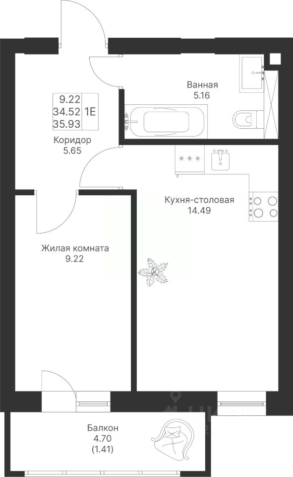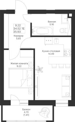 Главный акцент планировки — просторная кухня-гостиная. В ней будет удобно принимать гостей и устраивать уютные завтраки. Отдельная спальня дарит ощущение уединения и формирует зону для спокойного отдыха.