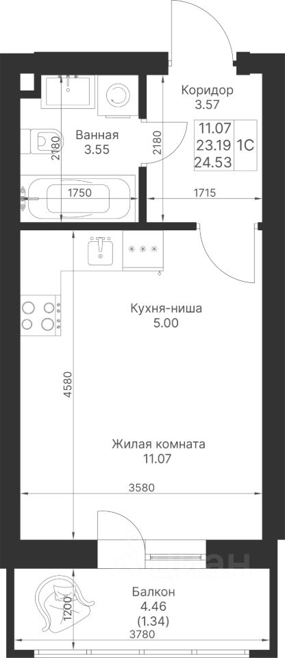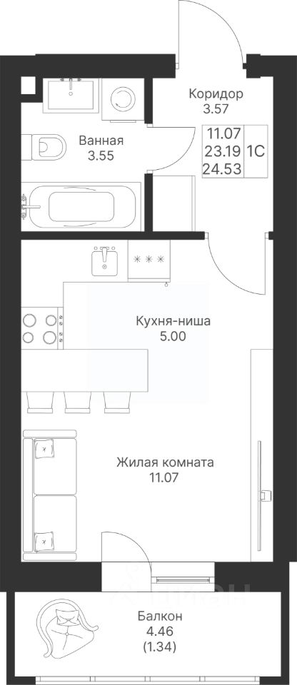 Продается квартира - студия 4 площадью 24,53 кв.м на 2 этаже в строящемся ПК 1-1 доме проекта "Дома у сада" компании "Aк Барс Дом".