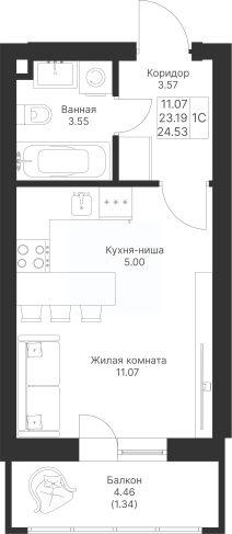 Просторная однокомнатная квартира — идеальное сочетание удобства и рациональности. Легко зонируется под гостевую и спальню, а кухня-ниша объединяет рабочую поверхность с уютным обеденным уголком.