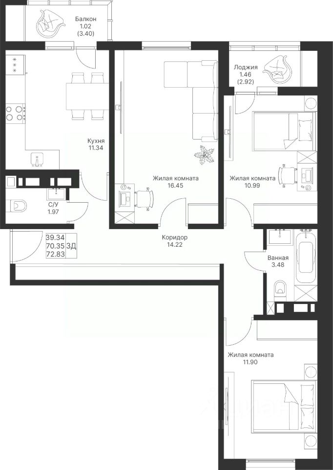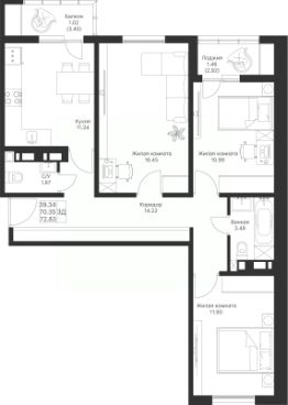 Функциональная трёхкомнатная квартира прекрасно подходит семье, в которой важно личное пространство каждого. Просторная кухня-гостиная с выходом на балкон, где будет приятно собираться всем вместе, три изолированные комнаты, которые позволяют организовать спальни, детскую или рабочий кабинет. Лоджия создает ещё одно пространство для любых жизненных сценариев.