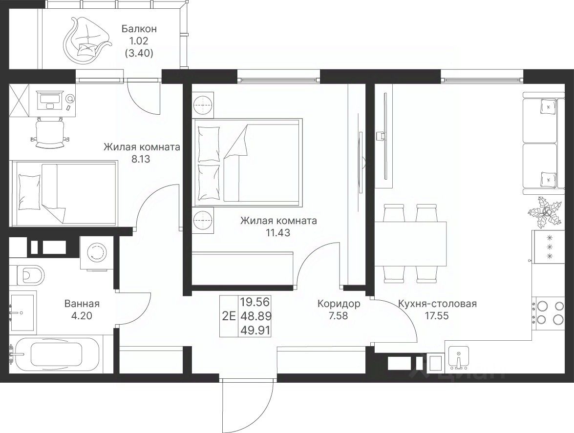Просторная 2-комнатная квартира создаёт комфортные условия для жизни всей семьи. Главный акцент — большая кухня-гостиная. Здесь удобно готовить, собираться за общим столом и проводить время вместе.