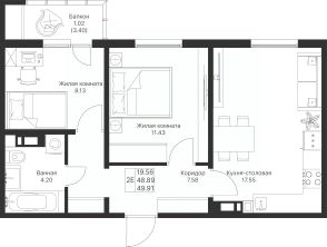 Продается 2-комнатная квартира 10 площадью 49,91 кв.м на 2 этаже в строящемся ПК 1-3 доме проекта "Дома у сада" компании "Aк Барс Дом".