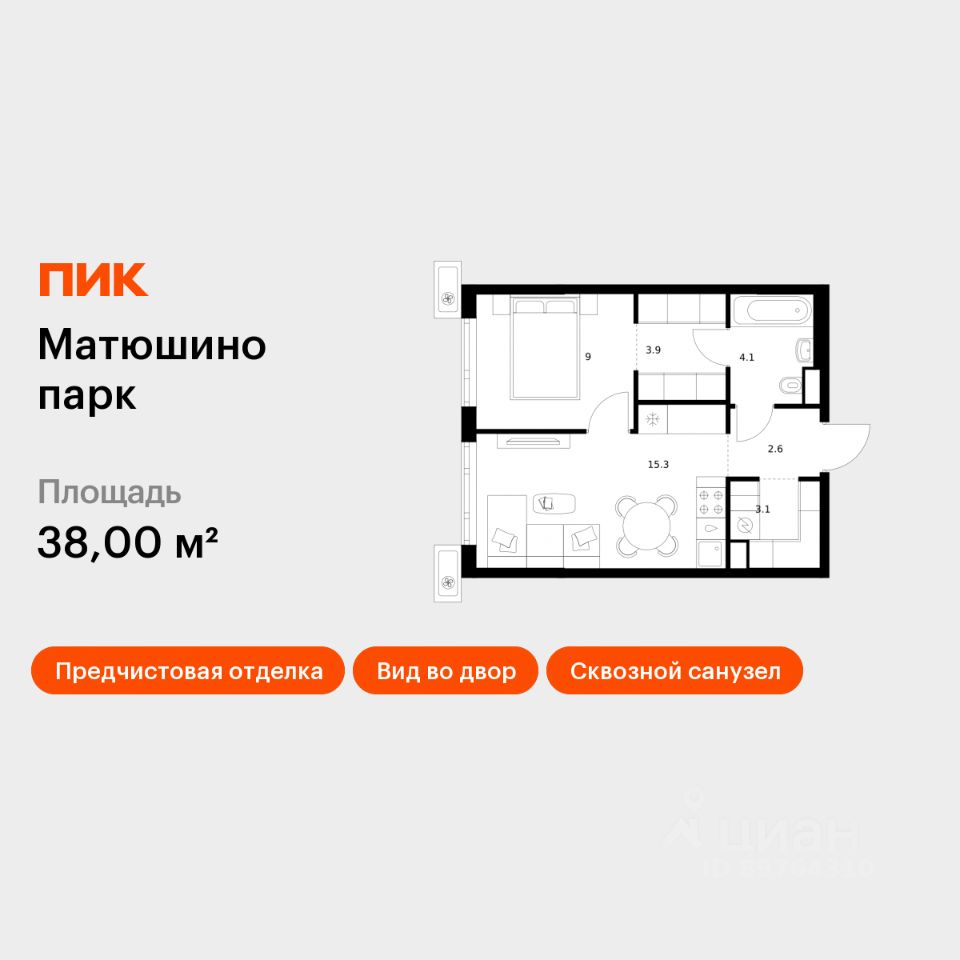 Продаётся 1-комн. квартира площадью 38 кв.м на 3 этаже 17 этажного дома (Корпус 5.1, Секция 1) проекта ПИК Матюшино парк. Светлый просторный подъезд на уровне земли, функциональная планировка, большие окна, предчистовая отделка.