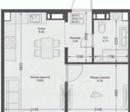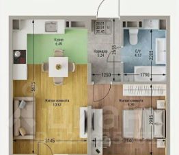 — Кухня, объединённая с гостиной: 6,5 + 10.6 м²