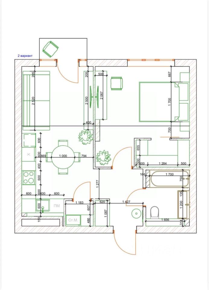 Гостевая зона : двухметровый раскладной диван с полноценным спальным местом и журнальный столик.