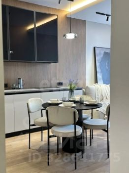 Просторная кухня-гостиная с зонированием и современным дизайнерским ремонтом.