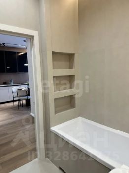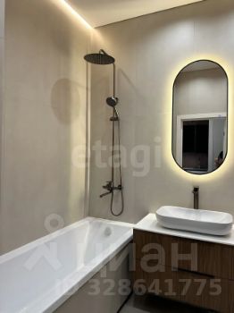 Современный санузел : Просторная ванна с функцией ТЕПЛЫЕ ПОЛЫ, гигиенический душ, широкоформатный керамогранит. Зеркало с подсветкой, полочки из керамогранита в зоне ванны, встроенный шкаф, столешница из керамогранита.Приглушенная подсветка создает уютную атмосферу.