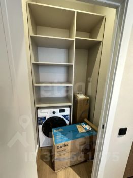 Гардеробная зона с системой хранения и стиральной машины, с местом для хранения гладильной доски.