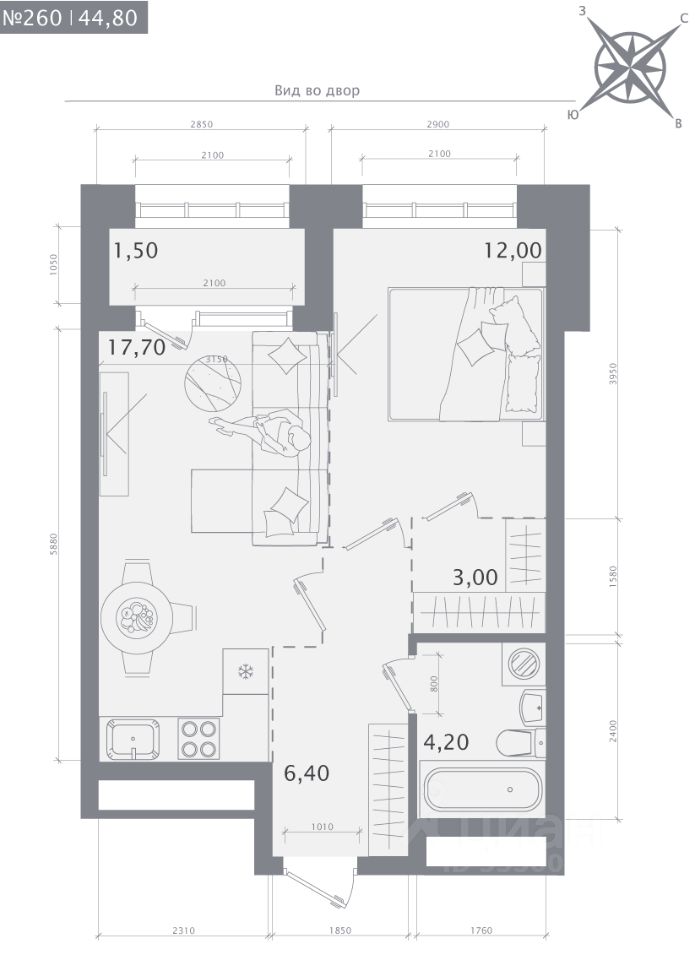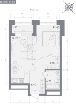 Продаётся 1-комнатная квартира в строящемся доме (Дом 2), срок сдачи: IV-кв. 2027, общей площадью 44.8 кв.м., на 8 этаже.