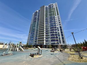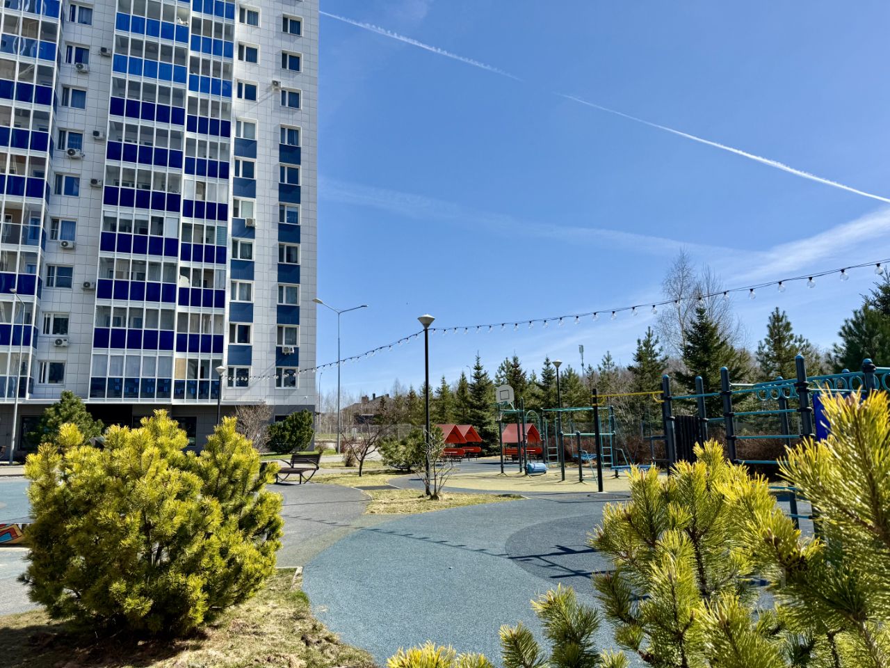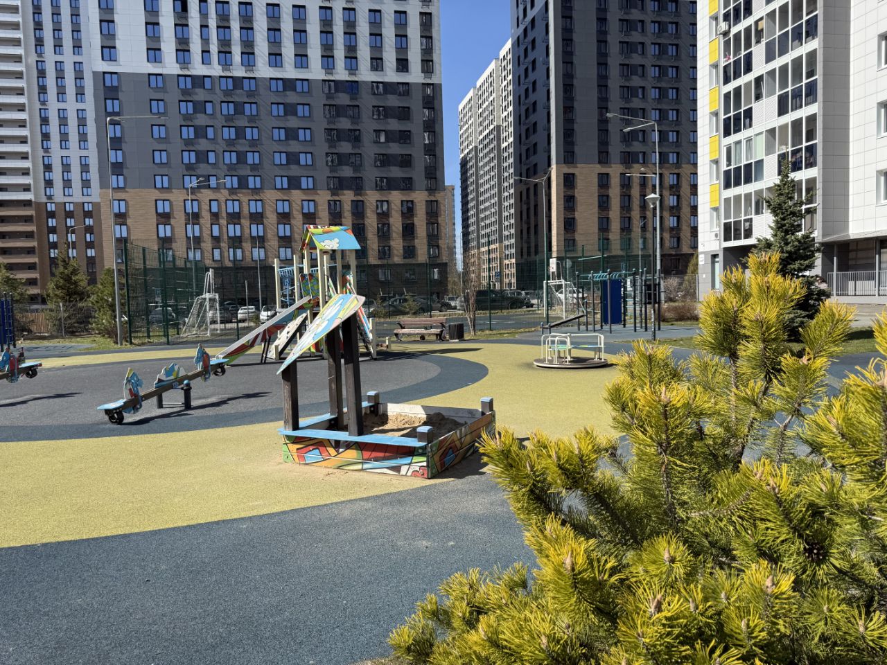 Двор: Огромная закрытая территория с современными детскими и спортивными площадками (баскетбольная зона, тренажеры). Много зелени и мест для прогулок. Двор без машин. Рядом автомобильная стоянка.