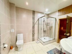 Санузел с теплым полом и сауной: душ, унитаз, шкафчик — для полного комфорта.
