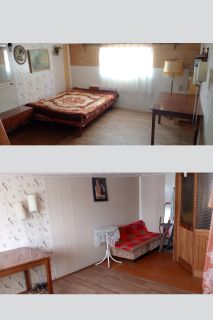В доме 2 этажа, на втором одна комната, на первом этаже одна комната утеплённая для проживания круглогодично, вторая небольшая(гардеробная)и летняя кухня.