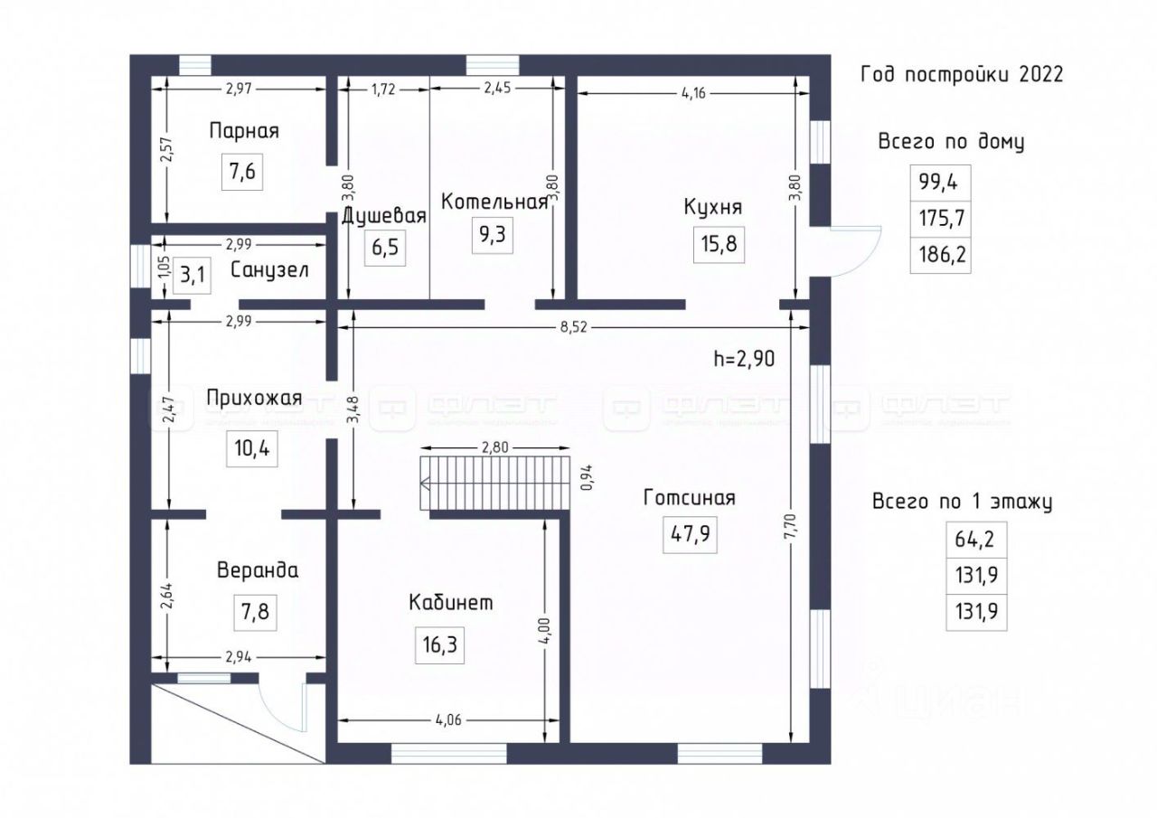 Итого по 1-этажу: 131,9 кв.м.