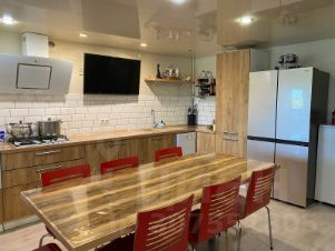 В доме пять спальных комнат, большой зал, холл и кухня-мечта хозяйки, с кухонным гарнитуром, бытовой техникой и большим столом. Так же имеются прачечная, два туалета, баня с комнатой для отдыха. Подвальное помещение под всем периметром дома состоит из двух отсеков, сухое и светлое, можно использовать в бизнесе.
