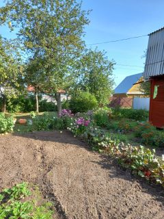 Участок 6 соток, есть плодовые деревья (яблони, вишня, слива) и кустарники (смородина красная, черная, белая, жимолость сладкая сортовая), виктория сортовая, малина. Со стороны аллеи новый забор из металлического штакетника, высокие ворота и калитка. Между соседями забор частично.