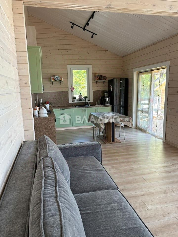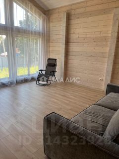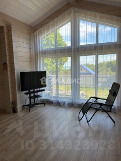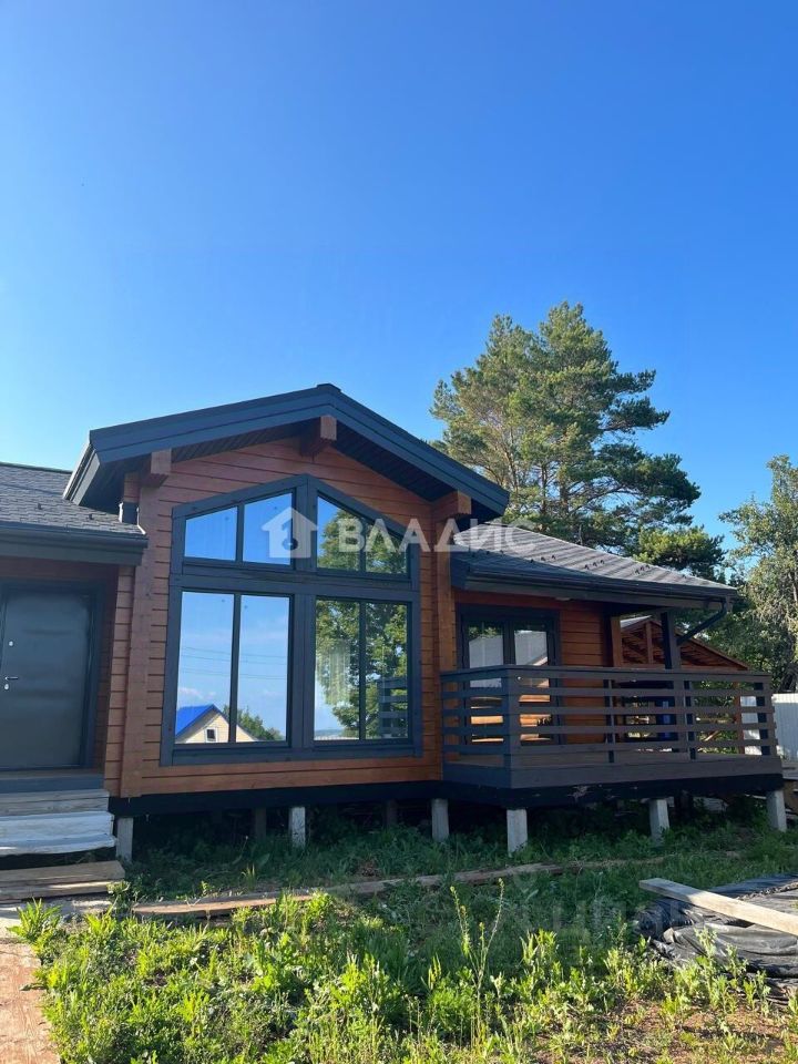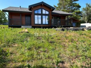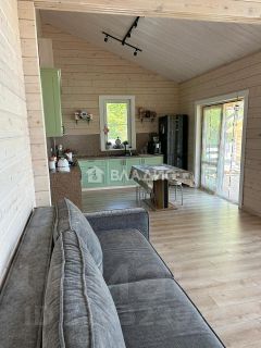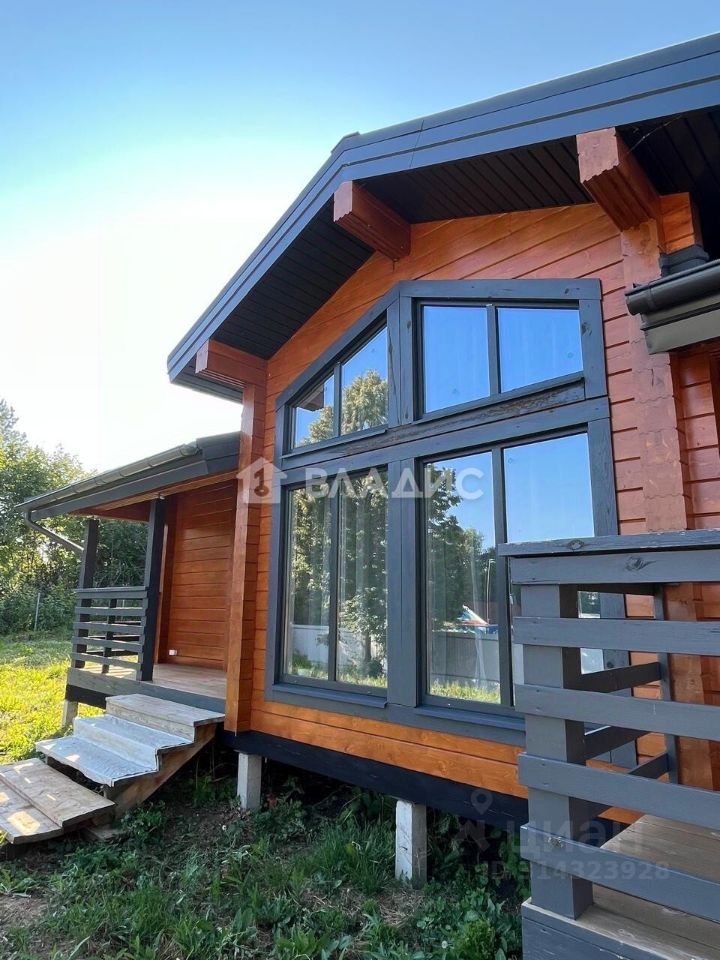 Дом построен из клееного бруса с витражными окнами, выходом на террасу и панорамными окнами, которые дают второи свет в гостинои.