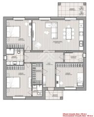 Три большие спальные комнаты, кухня-гостиная, 2 санузла, котельная, холл, терраса;