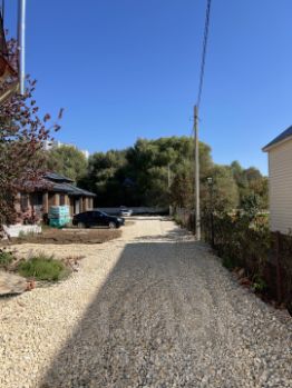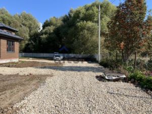 Шикарные подъездные пути к дому, широкая дорога, асфальтная крошка, около дома щебень.