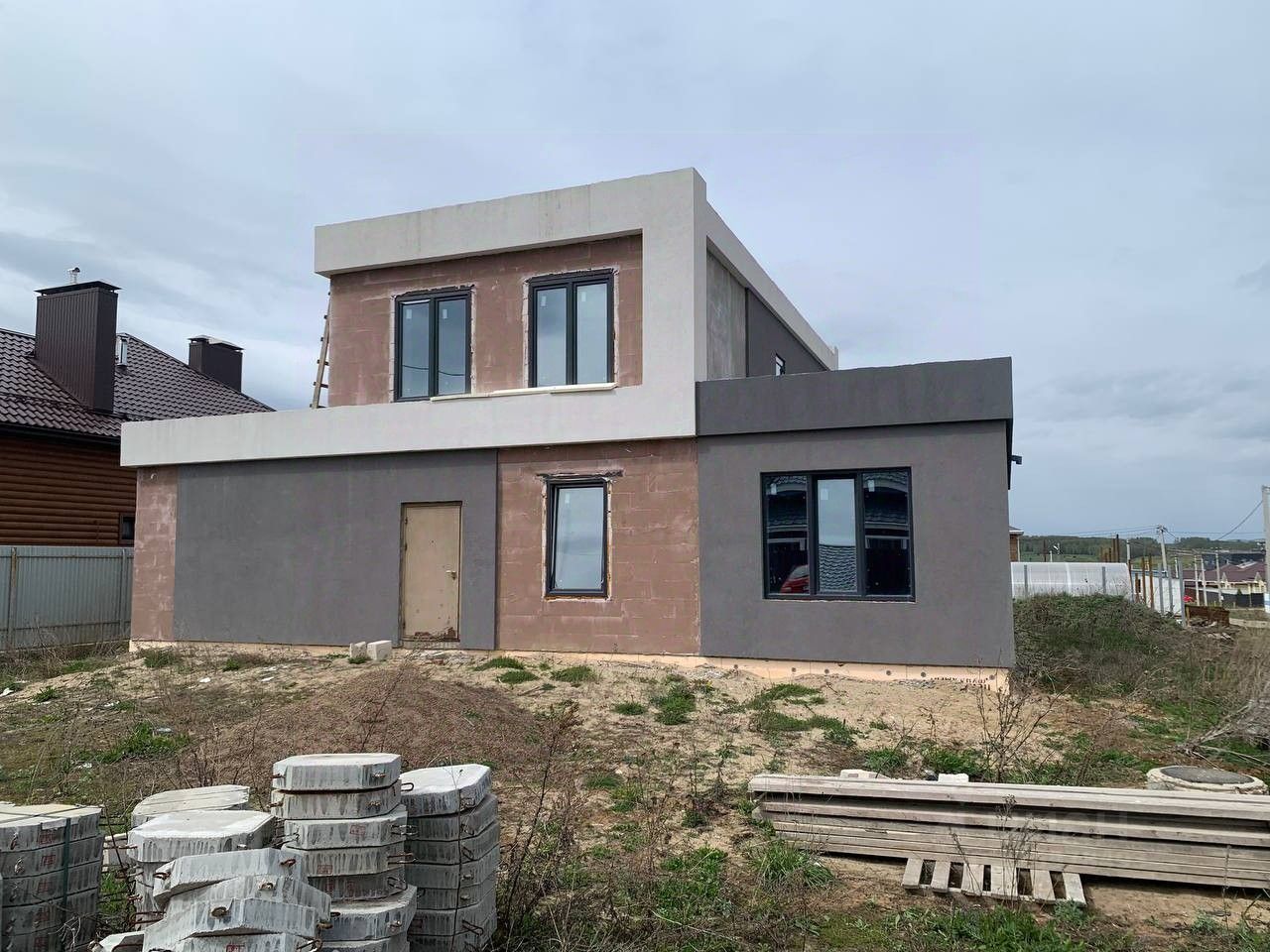 Дом построен из монолитных блоков и газобетона, на первом и втором этаже плиты перекрытия, перегородки из кирпича, монолитная лестница. На первом этаже большая гостиная-холл, кухня, гостевая, спальня, хоз.блок с котельной, ванная комната.