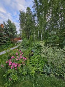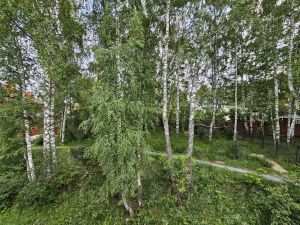 Участок площадью 14,5 соток с газоном, цветами, автоматическим поливом, более 50 хвойных деревьев и плодовые насаждения. 10-летняя величественная пихта. За участком березовая роща.