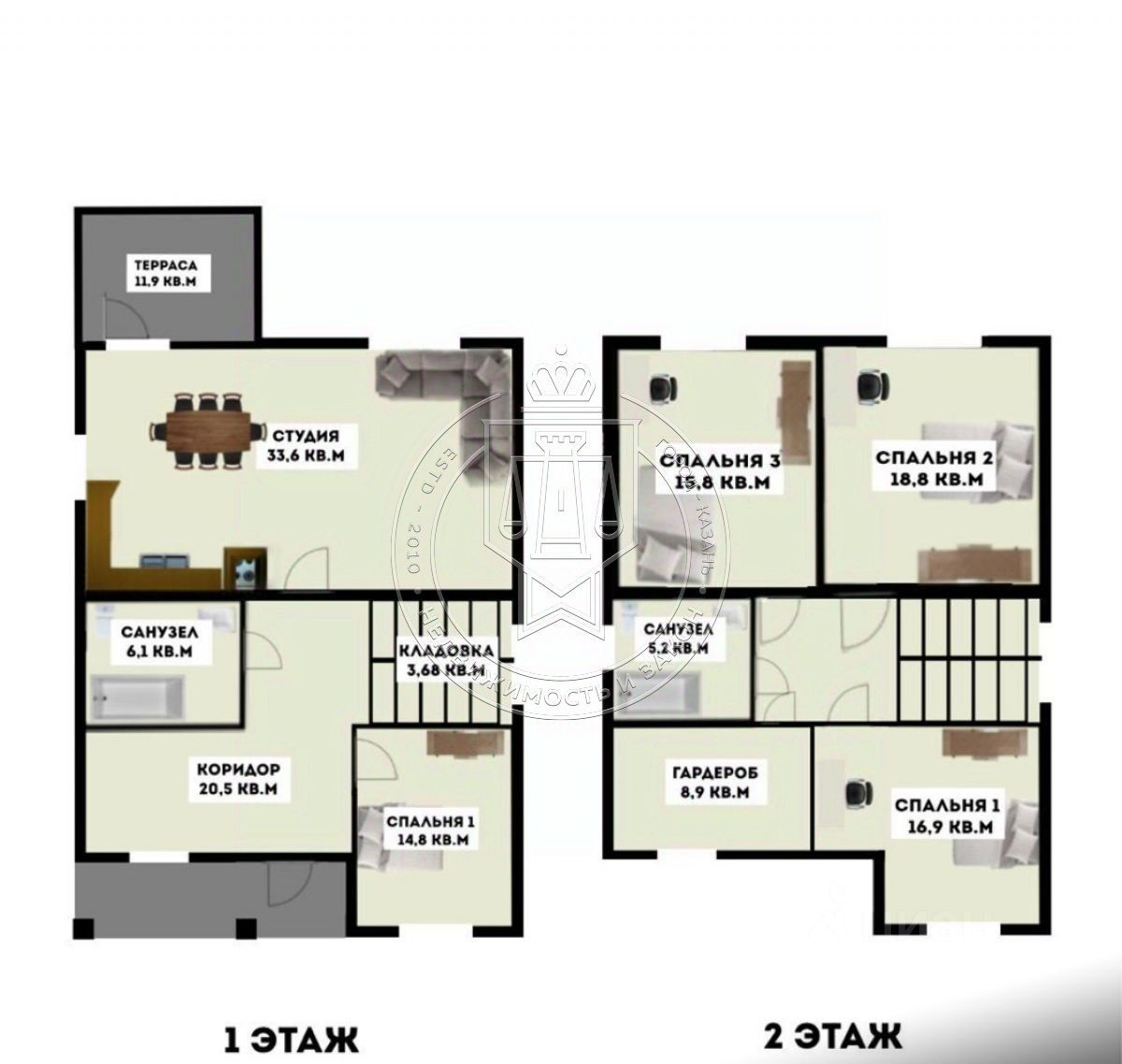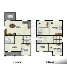 2 этаж: 3 спальные комнаты, санузел, гардеробная.