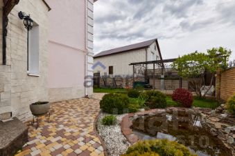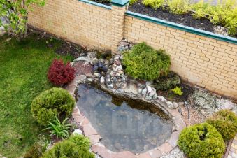Участок с ландшафтной зоной, пруд, фонтан, каменные дорожки, зоной отдыха и барбекю зоной.