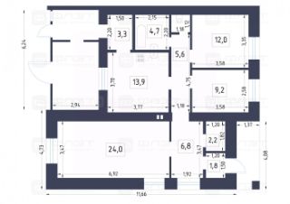 В доме 3 жилые комнаты - 24,00 м.кв, 12,00 м.кв и 9,20 м.кв.
