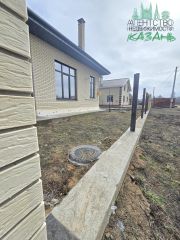 По всему периметру дома сделана утепленная отмостка, а так же сделан фундамент по периметру под забор.