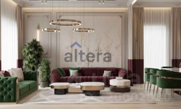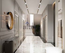 На первом этаже располагаются светлая гостиная с панорамными окнами, кухня-столовая, кабинет и одна из спален. Также предусмотрены просторные ванные комнаты и гардеробные.