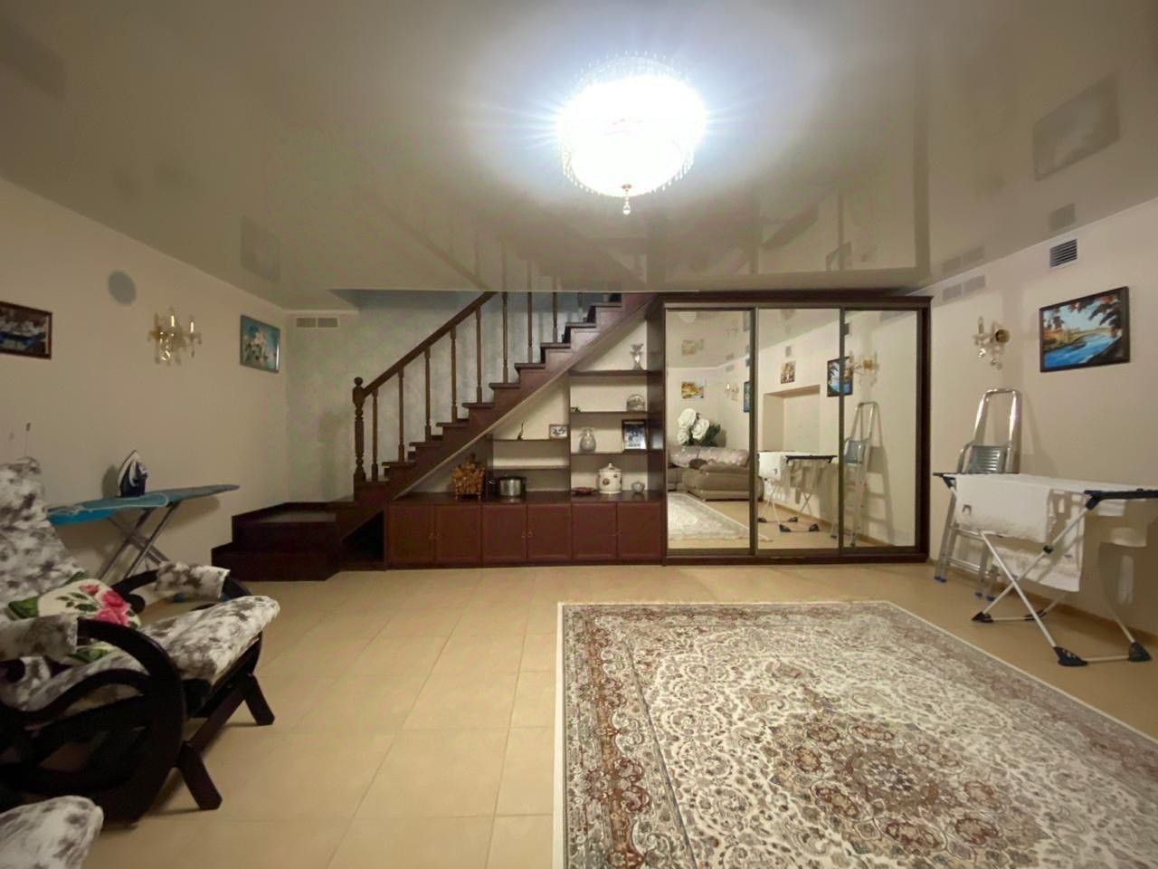 — На цокольном этаже: просторная комната 44,6 кв.м., дополнительное пространство для хранения вещей, занятий спортом, или просмотра фильмов на фоне теплого электрического камина.