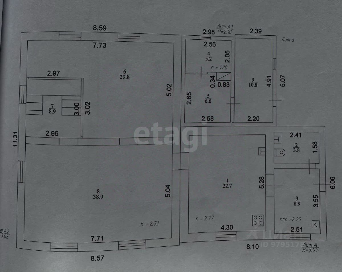 На 1 этаже расположена кухня - 22,7 кв.м, гостиная - 38,9 кв.м, спальня - 29,8 кв.м, санузел - 3,8 кв.м, прихожая - 8,9 кв.м, баня -22,6 кв.м.