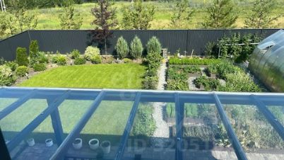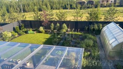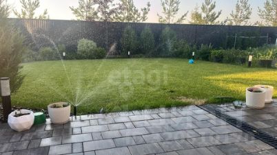 На участке выполнено ландшафтное благоустройство: участок выровнен, высажены деревья, уложен газон, смонтирован автополив.