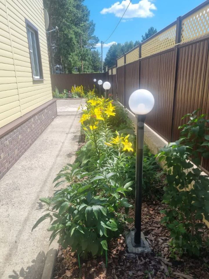 Участок в 10 соток полностью благоустроен: ухоженный газон с автоматическим поливом, плодовые насаждения и просторная зона для отдыха. На территории размещена теплица 46 метров, отдельно стоящая баня с беседкой и парковка на пять автомобилей.