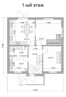 - На первом этаже: кухня, гостиная, кабинет или гостевая спальня, сауна, санузел, тамбур и прихожая.