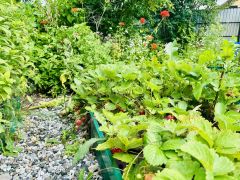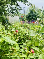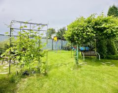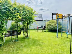 Участок ровный, без перепадов по высоте, полностью огорожен, имеет два въезда. На участке плотный рулонный газон с системой автополива и датчиком контроля уровня влажности. Есть зоны отдыха с качелями, зона барбекю, детский спорткомплекс, бассейн. На участке высажены и плодоносят: яблони, слива, грецкий орех, миндаль, крыжовник, виноград, груша, ежевика, черешня, орешник, жимолость, смородина, клубника, садовая земляника. Так же много сортовых цветов и медоносов.