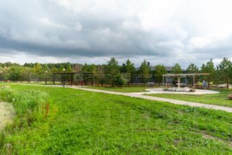 • Детская площадка и прогулочная зона с фонтаном у реки.