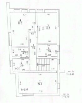 - Планировка дома состоит: кухня-столовая - 24,3кв.м., гостиная - 25,6кв.м., котельная - 6,2кв.м., холл - 15,4 и 7,4кв.м., хозяйственные помещения - 7,2; 12,2 и 24,1кв.м., жилые комнаты - 19,2 и 16,7кв.м., санузлы - 5,6 и 4,2кв.м., гардеробная - 7,8кв.м.;