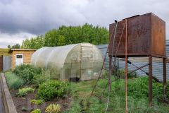 Цветы, молодые плодовые деревья, голубые ели, теплица, подсобные помещения, устроена система автополива, стационарная емкость для воды.