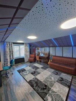 На мансарде расположены 2 комнаты, одна из них оборудована под студию звукозаписи и плюс комната отдыха.