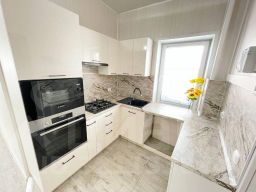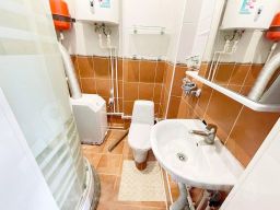 а напольное покрытие - ламинат. Санузел совмещен. Установлена душевая кабина, унитаз, раковина, имеется бойлер. Выложена плитка.