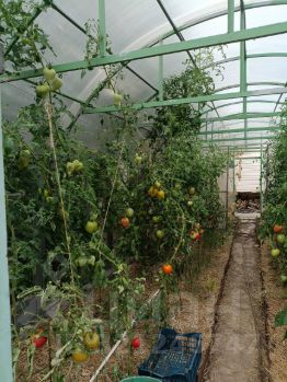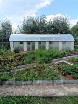 - кирпичная теплица 9х3,5, покрыта поликарбонатом.