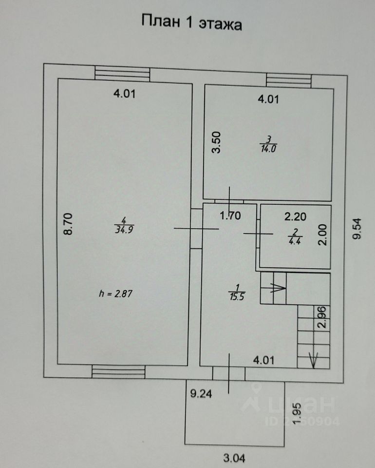 1 этаж 34,9 кв.м. кухня-гостиная, спальня 14 кв.м. с/у 4,4 кв.м.