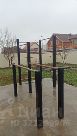 Рядом имеется зона для занятия спортом (три турника, брусья, шведская стенка), основание - бетонированная площадка.